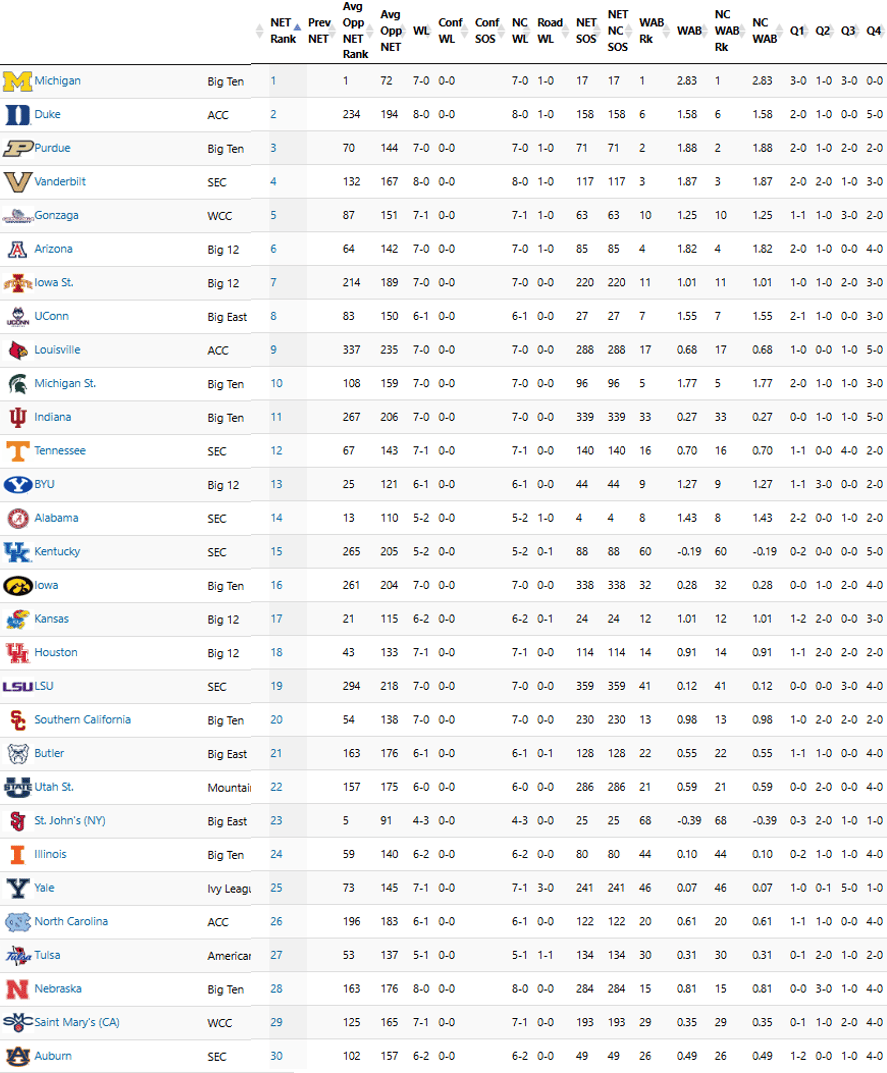 There’s a long table version of the NET here, which is fine if you’re just into perusing. But if you really want to dive in, try this link. It’s sortable by team, includes more data points and lets you sort. That’s what I’ve used for a screengrab of the Top 30 teams below.